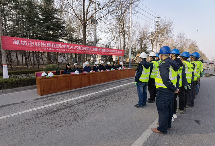 为提高公司应对突发事故能力,有序应对高温水供热管网可能突发的事故,减少突发事故对城区供热造成的影响,最短时间排除故障恢复供热,更好、更稳定、更可靠地保证市区供暖安全,最大程度保障抢修人员、设备安全,1月6日,民生热电公司在寒亭丰华路开展供热管道应急抢修演练。市城管局、市公用事业服务中心,奎文区、寒亭区、经济开发区公用事业中心有关单位领导出席活动。