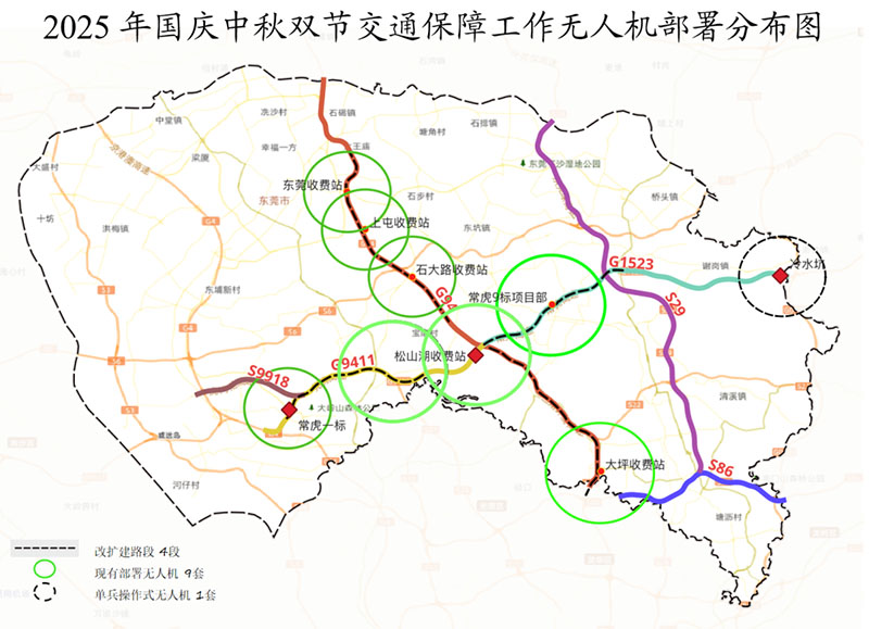 与往年不同的是,今年国庆中秋长假期间,东莞市低空经济发展有限公司(以下简称“低空经济公司”)在东莞交控集团的统筹安排下,以“机巢式无人机+单兵操作式无人机”协同作业模式,整合两者优势,形成“定点驻守+灵活巡查”的立体作业体系,对重点交通堵点实现精准覆盖,与固定监控相互补充构建空地一体化动态监控网络,为广大市民出行的通畅与安全提供技术保障。