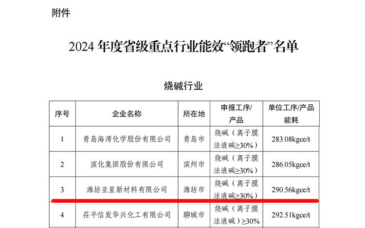 近日,省工信厅公布了2024年度省级重点行业能效“领跑者”名单,全省13个行业25家企业共29个产品/工序入选,亚星化学全资子公司亚星新材料成为我市烧碱行业唯一入选企业。
