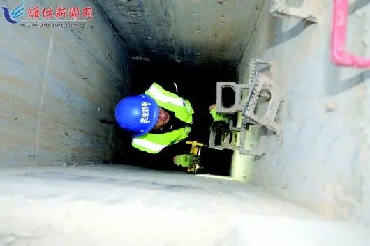为给记者壮胆,李永全先行下井,用照明灯给记者照着。往下爬时,记者几次脚底打滑,差点踩空。随后,辛志文和庄彦凤紧随在记者后面来到井下,几人开始了对管线的巡检养护。