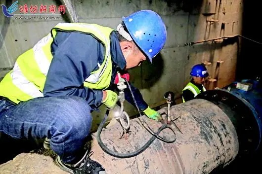借着井口透过的光和照明灯光,记者看到,管道架设在距井底两米高的位置,管道内就是从发电厂输送至寒亭区的高温水。几人先是核查了一下计量表是否正常运转,随后又检查几处管道连接口的螺丝是否牢固。经检查,有多个螺丝出现松动,他们连忙用扳手拧紧。辛志文介绍,由于管道内是高温水,受热胀冷缩作用,螺丝很容易松动,检修时就需要时刻关注。
