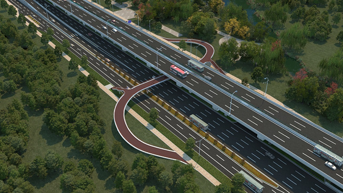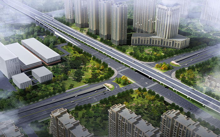 渤海路节点采用“跨线+下穿”立交形式,宝通街主线高架跨越渤海路,并在路口西侧设上下匝道;渤海路主线通过地道下穿宝通街;转向交通通过地面层实现。
