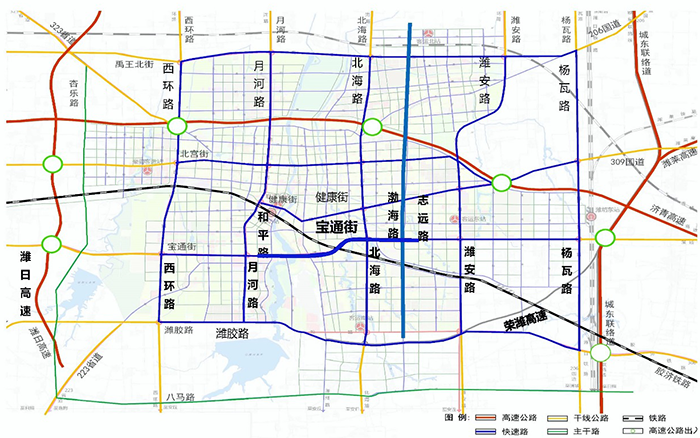 根据潍坊市城市总体规划和综合交通规划,中心城区规划搭建“五横五纵”的快速交通网络。宝通街是贯穿中心城区东西方向的重要交通干道,也是“五横五纵”快速路网中的重要“一横”。宝通街快速路工程建设意义重大,必要性强,有助于提高城市交通出行的便捷性及快速化程度。