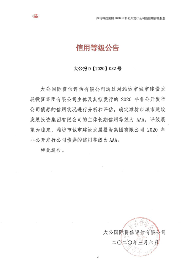 3月6日,集团公司被国内权威信用评级机构大公国际确定为AAA主体长期信用等级,评级展望为稳定,成为潍坊市首家获得AAA最高企业信用等级的国有企业,也是我市各类企业中除潍柴集团之外唯一获得AAA最高企业信用等级的企业。6月22日,集团公司再次获得国内权威信用评级机构东方金城给予的AAA最高信用等级,短短三个月的时间,便获得两家权威信用评级机构的最高信用等级,这不仅是对集团公司“以投资兴产业、以产业促发展,以发展扩大再投资”转型发展的高度肯定,也是资本市场对集团公司综合实力和发展前景的充分认可。AAA最高企业信用等级的取得,拓宽了融资渠道,提高了筹资能力,充分推动了集团公司高质量可持续发展和“生态、开放、活力、精致”的现代化高品质城市建设。